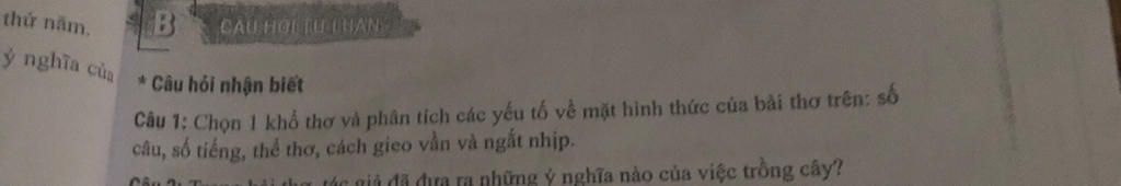 Chọn một khổ thơ và phân tích các yếu tố về mặt hình thức của bài thơ trên số câu số tiếng thể thưa các gieo vần và ngắt nhịp bài hát trồng cây