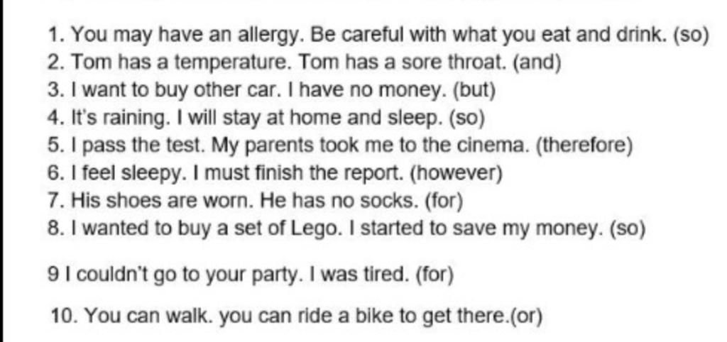 `1.` You may have an allergy, so be careful with what you eat and drink. `2.` Tom has a temperature and a sore throat.$\\$ `3.` I want to buy other car, but I have no money.$\\$ `4.` It’s raining, so I will stay at home and sleep.$\\$ `5.` I pass the test. Therefore; my parents took me to the cinema.$\\$ `6.` I feel sleepy. However, I must finish the report.$\\$ `7.` His shoes are worn for having no socks. $\\$ `8.` I wanted to buy a set of Lego, so I started to save my money.$\\$ `9.` I couldn’t go to your party for tiring.$\\$ `10.` You can walk or ride a bike to get there.$\\$
