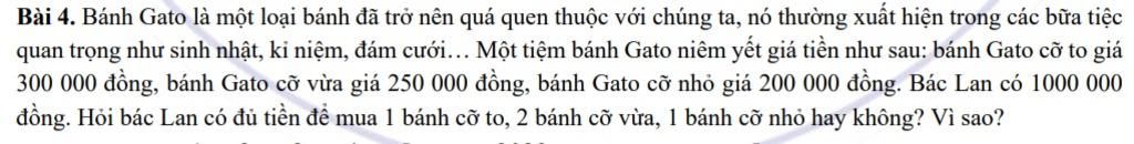 Vậy Bác đủ tiền để mua `1` bánh gato cỡ lớn, `2` bánh gato cỡ vừa và `1` bánh gato cỡ nhỏ