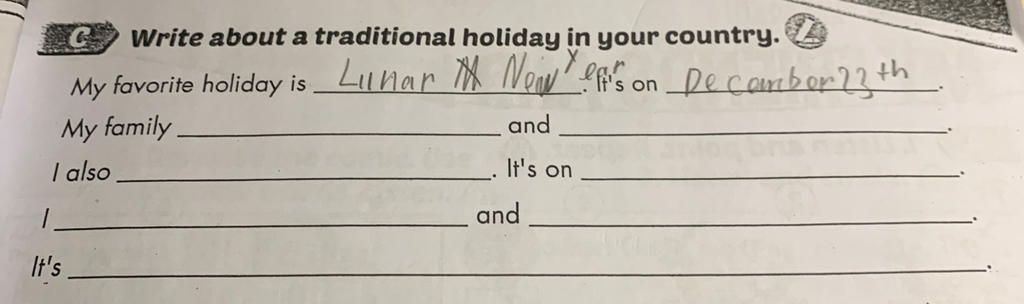 My favourite holiday is Lunar New Year. It's on December $23^{rd}$. My family decorates and goes shopping in this day. I also like Teachers' Day. It's on November $11^{st}$. I visit my teacher and give flowers or wishes. It's very interesting.