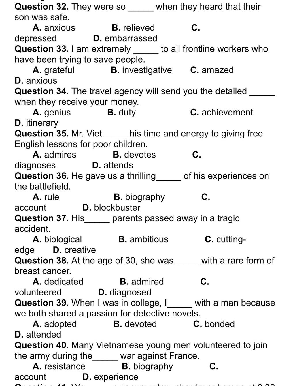 Câu 35: Mr. Viet ___ his time and energy to giving free English lessons for poor children.