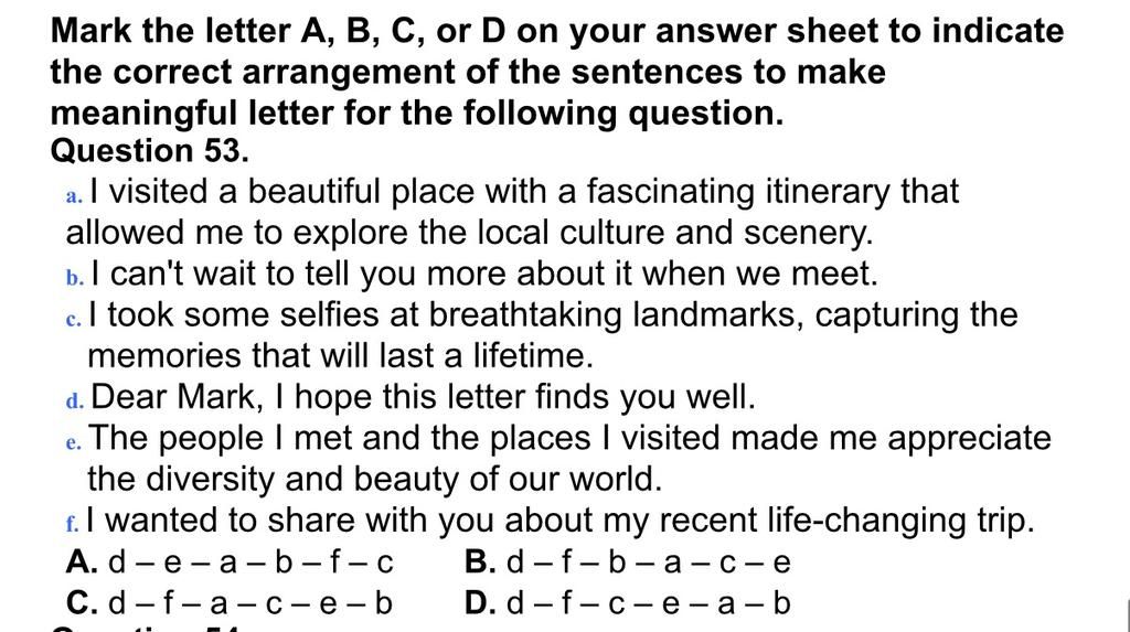 `f.` I wanted to share with you about my recent life-changing trip. (Tôi muốn chia sẻ với bạn về chuyến đi thay đổi cuộc đời gần đây của tôi.)