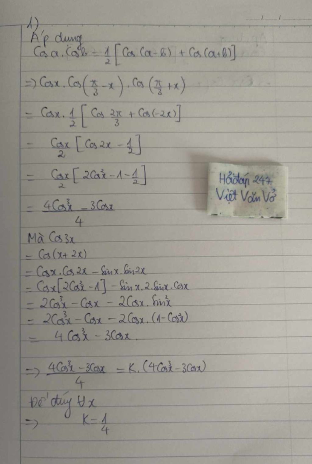 Câu 1 : Biết rằng cosx.cos( $\frac{\pi}{3}$ - x )cos($\frac{\pi}{3}$ + x ) = k.cos3x, Tính k ( dạng thập phân )