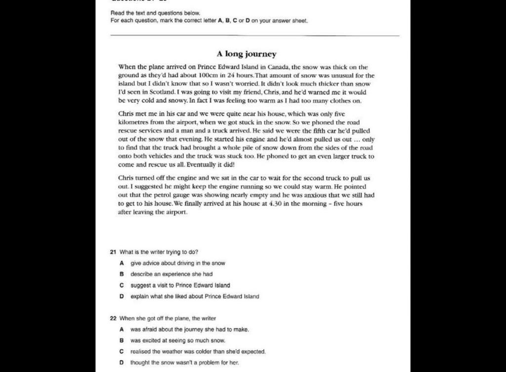 `22`.`D`.thought the snow wasn't a problem for her. (nghĩ rằng tuyết không phải là vấn đề đối với cô ấy.)