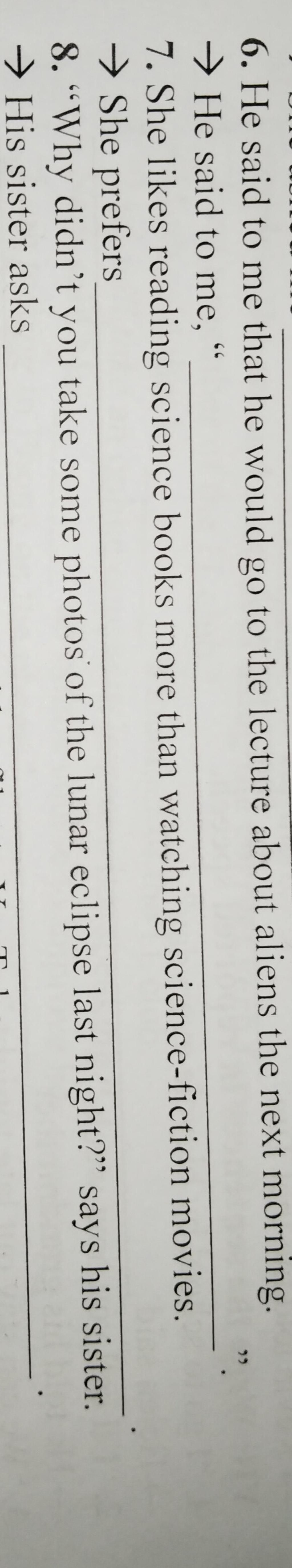 `6.` He said to me " I will go to the lecture about aliens tomorrow morning "