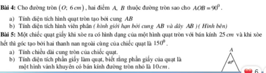 Bài 4: Cho đường tròn (O; 6cm), hai điểm A, B thuộc đường tròn sao cho AOB=90.