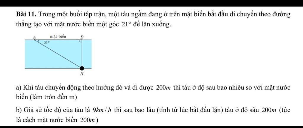 Bài 11. Trong một buổi tập trận, một tàu ngầm đang ở trên mặt biển bắt đầu di chuyển theo đường