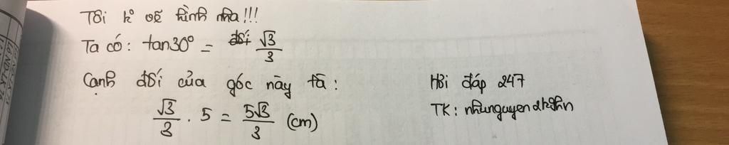 Một ô cửa sổ có dạng tam giác vuông với một góc nhọn bằng 30độ và cạnh kề với góc 30độ bằng 5cm. Tính cạnh đối của góc này.