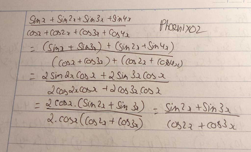 `=((sinx+sin3x)+(sin2x+sin4x))/((cos+cos3x)+(cos2x+cos4x))`