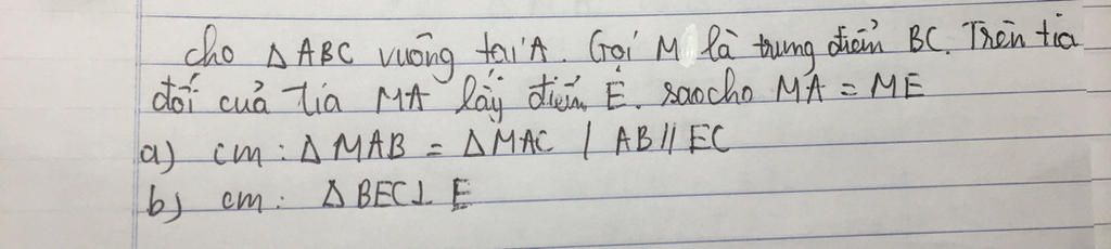 Vì `ΔMAB=ΔMEC` nên `AB=EC` và `\hat{ABC}=\hat{BCE}`