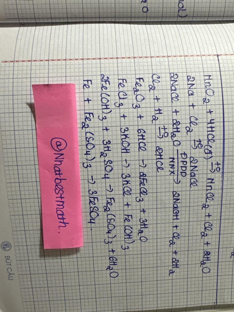 a/ MnO2 -----> Cl2 ------------>NaCl ---------> Cl2 --------> HCl-----> FeCl3 --------> Fe(OH)3 -------> Fe2(SO4)3---------------> FeSO4