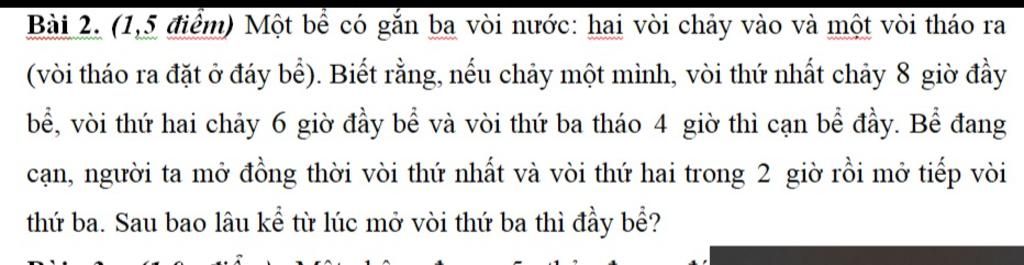 Bài 2. (1,5 điểm) Một bể có gắn ba vòi nước: hai vòi chảy vào và một vòi tháo ra