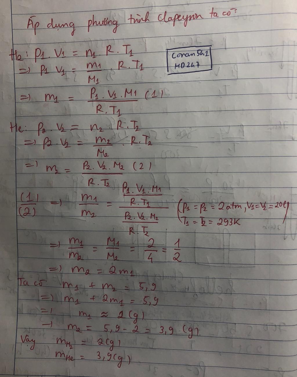 Một bình có dung tích 20 lít chứa hỗn hợp khí H2 và He ở 20 độ C và áp suất 2atm. Biết khối lượng của hỗn hợp là 5,9g. Tính khối lượng của H2 và He trong hỗn hợp