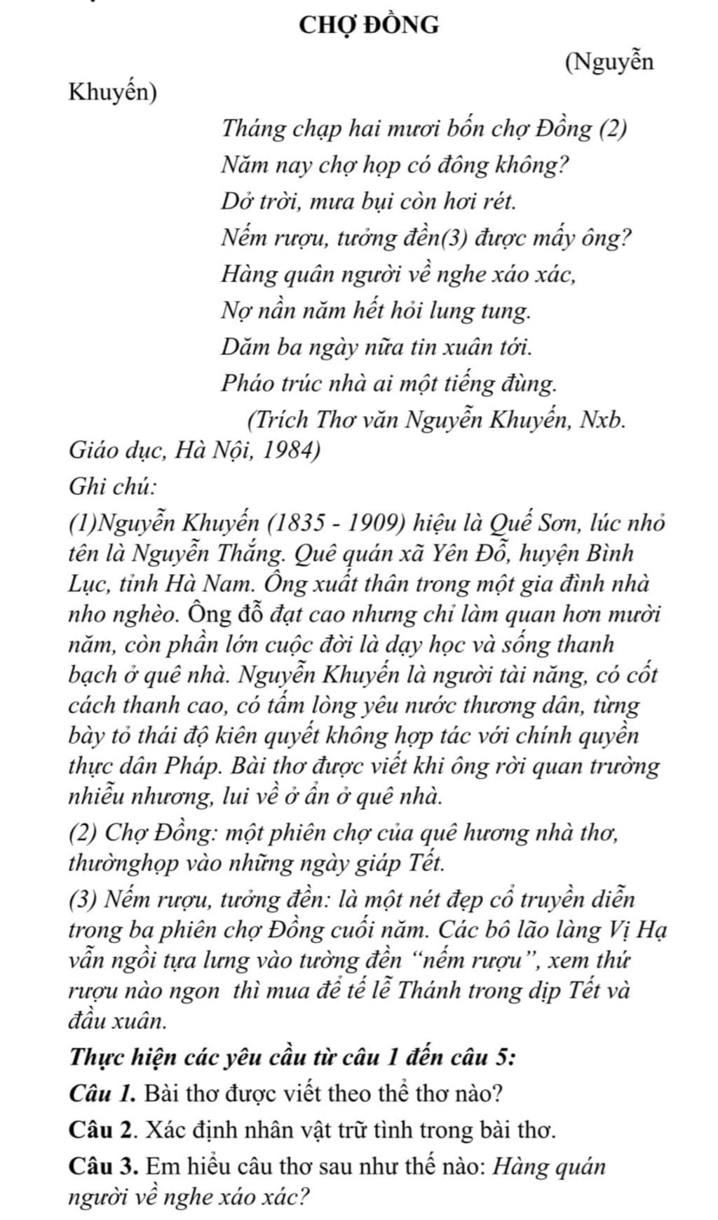 3. Ý hiểu của em về câu thơ "Hàng quán người về nghe xáo xác" : cảnh tượng nhộn nhịp, ồn ào của chợ Đồng vào ngày họp chợ. Từ "xáo xác" gợi lên âm thanh hộn loạn, tấp nập của người mua kẻ bán, tạo nên một bức tranh sống động về không khí chợ phiên. Cảnh tượng này phản ánh sự sôi động, tấp nập của cuộc sống thường nhật, đặc biệt là vào những ngày cuối năm khi mọi người đều bận rộn chuẩn bị cho Tết.