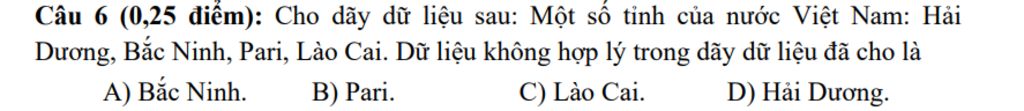 Cho dãy dữ liệu sau: Một số tỉnh của nước Việt Nam: Hải Dương, Bắc Ninh, Pari, Lào Cai. Dữ liệu không hợp lý trong dãy dữ liệu đã cho là