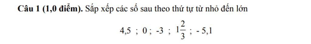 Vậy các số `4,5 ; 0 ; -3 ; 1 2/3 ; -5,1` được sắp xếp theo thứ tự từ nhỏ đến lớn là `-5,1;3;0;1 2/3;4,5`