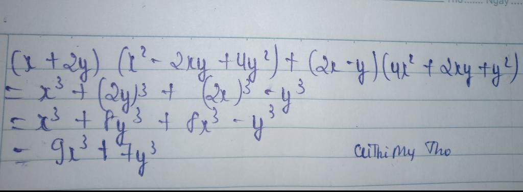 `(x + 2y)(x^2-2xy+4y^2)+(2x-y)(4x^2+2xy+y^2)=x^3+8y^3+8x^3-y^3`