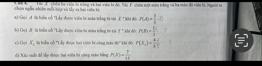 a) Gọi A là biến cố "Lấy được viên bi màu trắng từ túi . X " khi đó: P(A) =