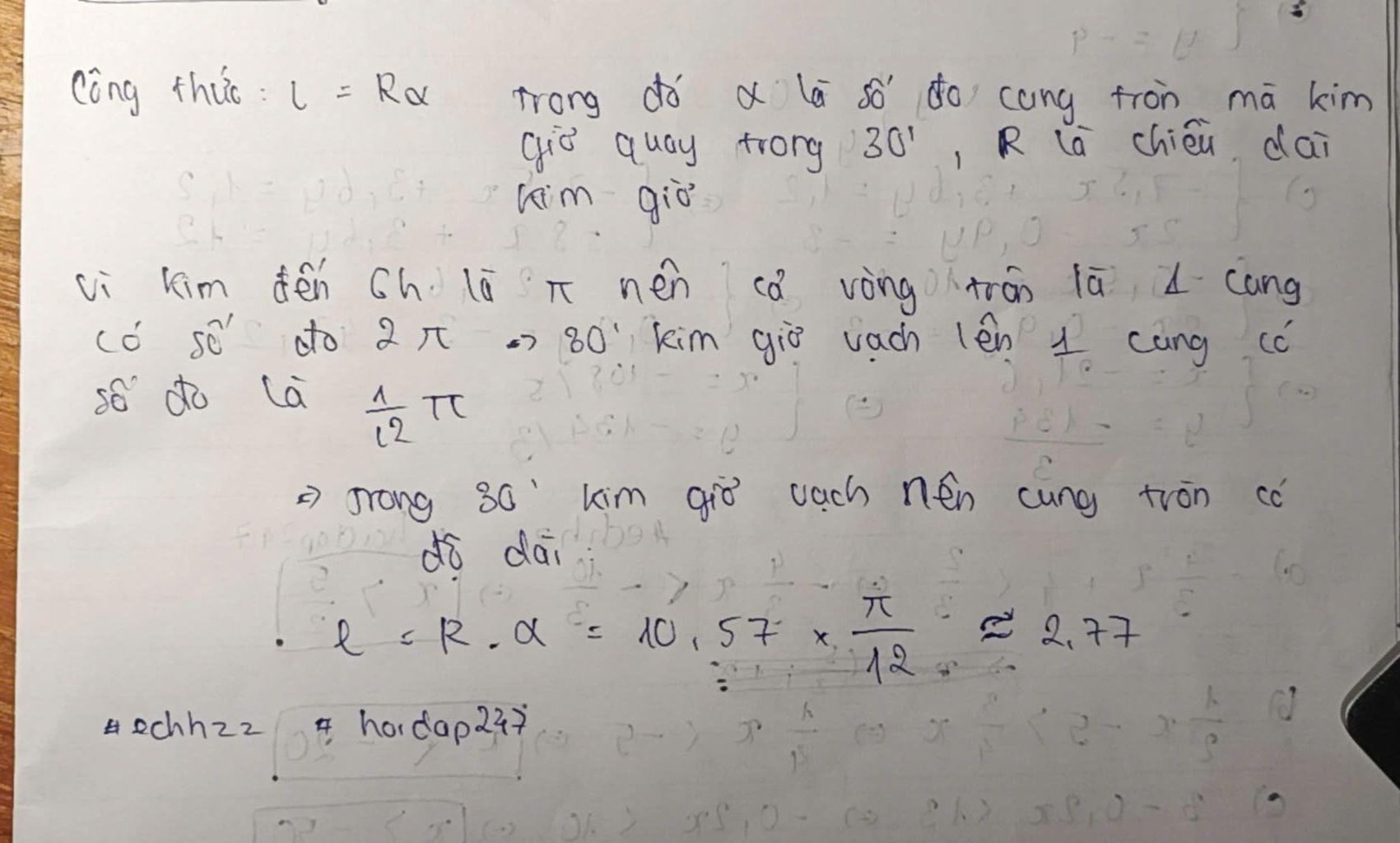 Một đồng hồ treo tường có kim giờ dài 10,25cm, kim phút dài 13,25cm. Trong 30 phút kim giờ vạch nên cung tròn có độ dài bao nhiêu?