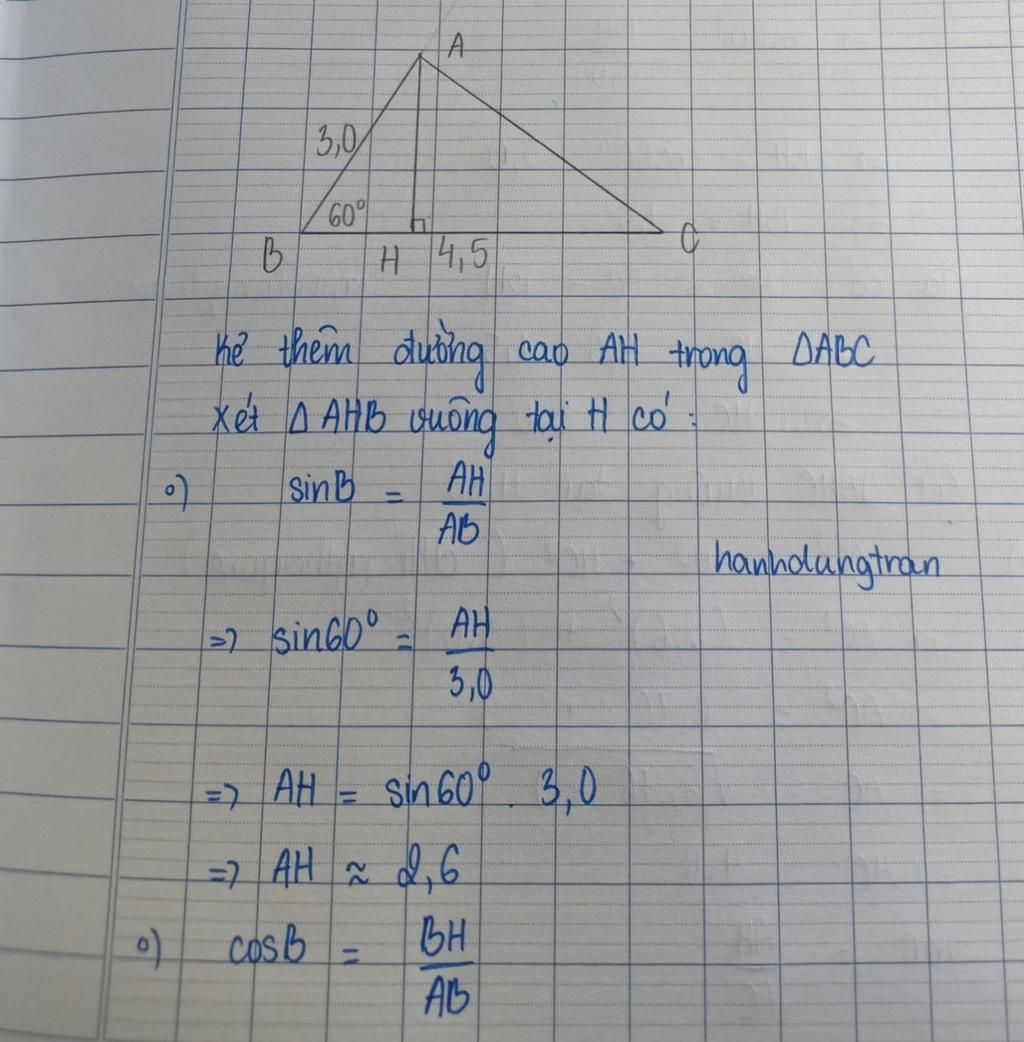Giải tam giác nhọn `ABC` biết góc `B=60^0,AB=3,0` và `BC=4,5`