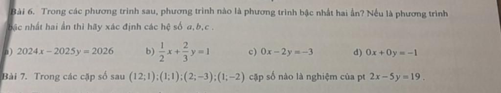 Bài 6. Trong các phương trình sau, phương trình nào là phương trình bậc nhất hai ẩn? Nếu là phương trình