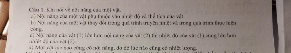 c) Nội năng của vật (1) lớn hơn nội năng của vật (2) thì nhiệt độ của vật (1) cũn ...
