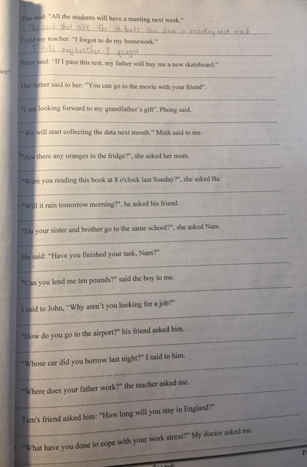 Bài tập này yêu cầu bạn chuyển những câu trực tiếp (direct speech) thành câu gián tiếp (indirect speech).