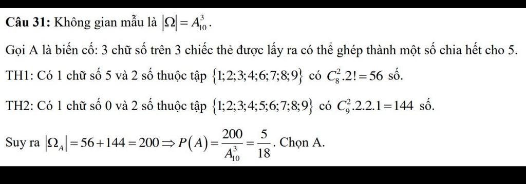 Gọi A là biến cố: 3 chữ số trên 3 chiếc thẻ được lấy ra có thể ghép thành một số chia hết cho 5.