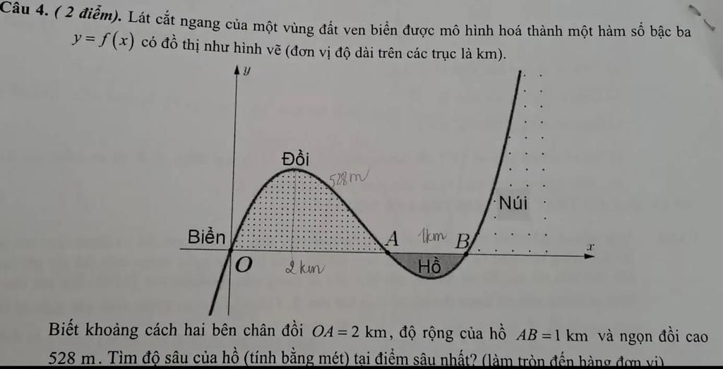 Ta có: $O(0,0), A(2,0), B(3,0),$ đỉnh đồi cao $528m=0.528km$