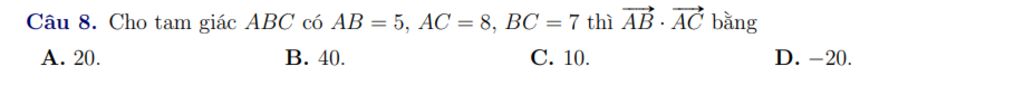 Cho tam giác ABC có AB = 5, AC = 8, BC = 7 thì AB . AC bằng