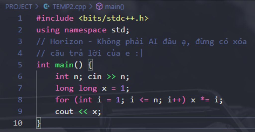Ý tưởng: Cho vòng lặp `"for"` từ `1` đến `n` và cho biến `x` nhân với từng giá trị.