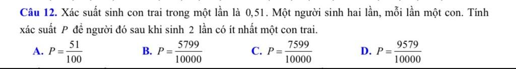 Xác suất để sau khi sinh $2$ lần có ít nhất $1$ con trai là: