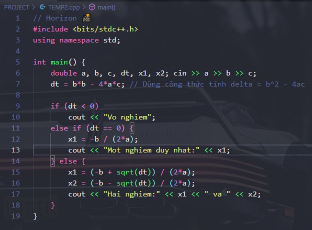 dt = b*b - 4*a*c; // Dùng công thức tính delta = b^2 - 4ac