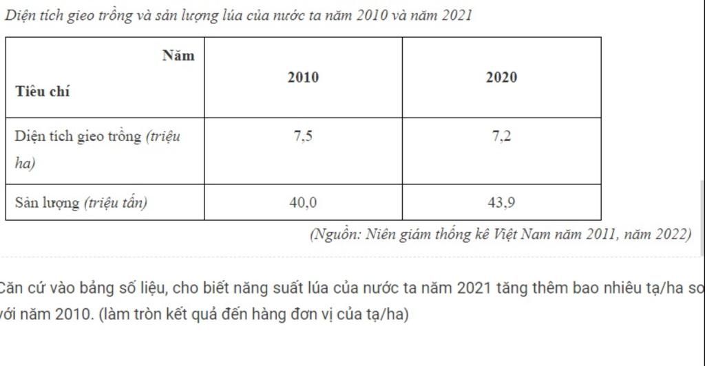 `->` Năng suất lúa của nước ta năm `2021` tăng thêm `7,7` tạ/ha so với năm `2010`