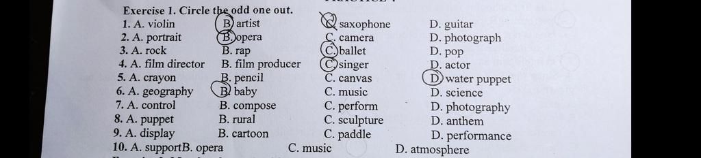 `2)` `B.` liên quan tới ca nhạc, còn lại liên quan đến nghệ thuật
