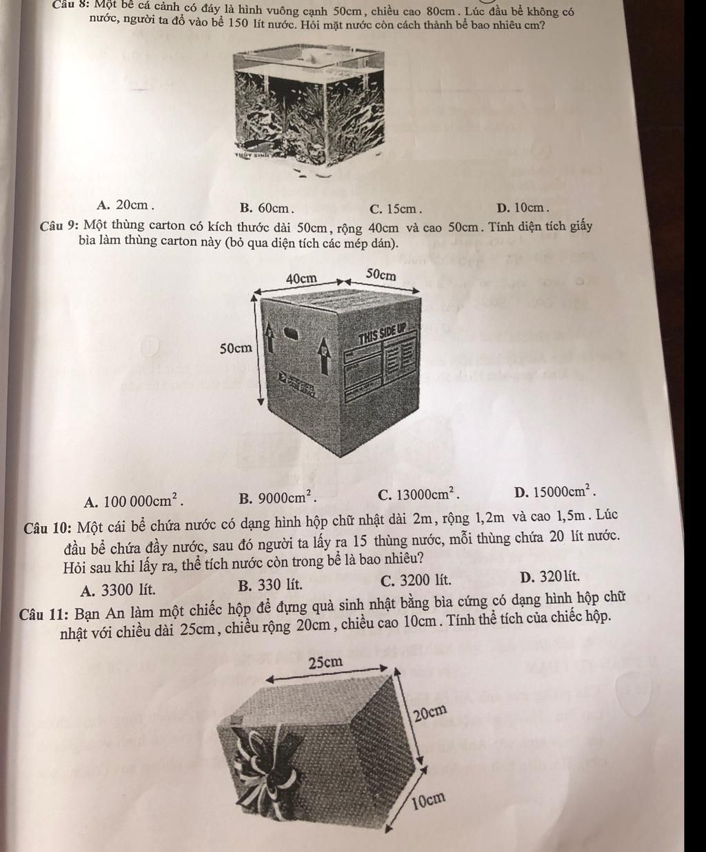 Câu 9: Một thùng carton có kích thước dài 50cm, rộng 40cm và cao 50cm. Tính ...