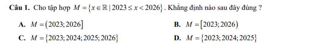 Cho tập hợp M = {m ∈ R | 2023≤x<2026} . Khẳng định nào sau đây đúng ?