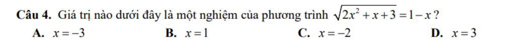 Giá trị nào dưới đây là một nghiệm của phương trình $\sqrt[]{2x^{2} + x + 3}$ = 1 − x?