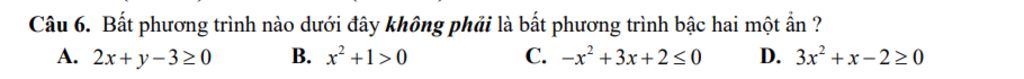 Dựa vào định nghĩa ta nhận thấy các đáp án `B,C` và `D` là các bất phương trình bậc hai một ẩn