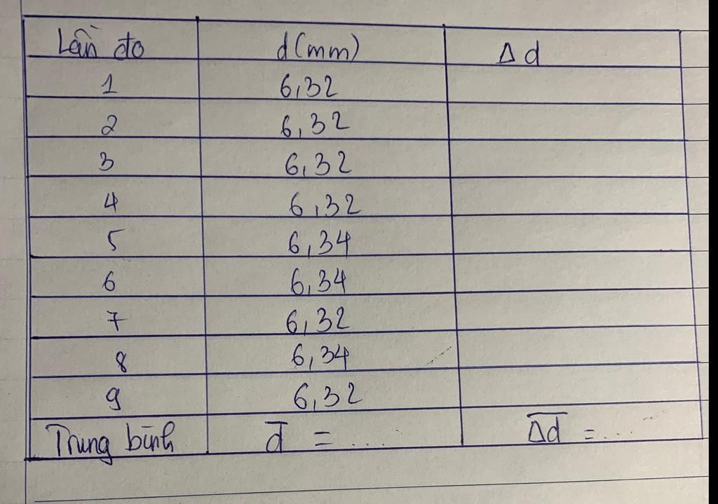 Bảng dưới thể hiện kết quả đo đường kính của một viên bi thép bằng thước kẹp có sai số dụng cụ là 0,02 mm.Tính sai số tuyệt đối,sai số tương đối và biểu diễn kết quả đo có kèm theo sai số