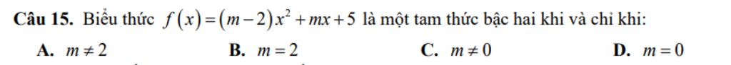 Biểu thức f(x)=(m-2)x^2 + mx + 5 là một tam thức bậc hai khi và chỉ khi: