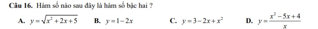 `=>` Hàm số `y=3-2x+x^2` là hàm số bậc hai với `a=1;b=-2;c=3` và `a\ne0`