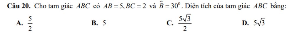 Cho tam giác ABC có AB = 5, BC = 2 và B = 30° . Diện tích của tam giác ABC bằng: