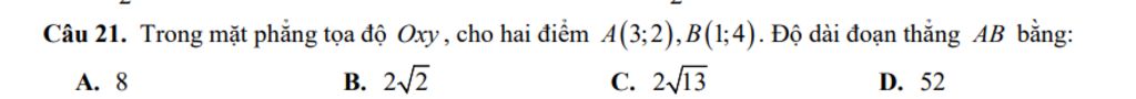 Trong mặt phẳng tọa độ Oxy, cho hai điểm A(3;2),B(1;4). Độ dài đoạn thẳng AB bằng: