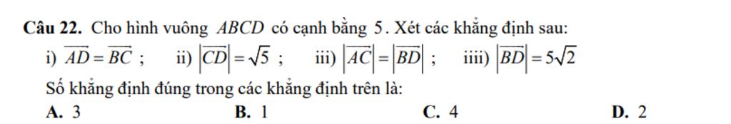 `iiii)` Đúng, `BD` là cạnh huyền của tam giác vuông cân dẫn đến `vec[BD]` có độ dài là `5sqrt2`.