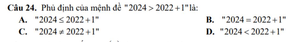 Nên phủ định của mệnh đề " `2024>2022+1` '' là mệnh đề '' `2024<=2022+1`