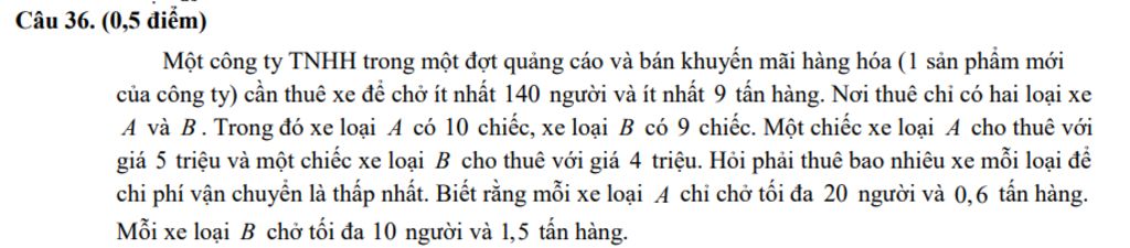 Một công ty TNHH trong một đợt quảng cáo và bán khuyến mãi hàng hóa (1 sản phẩm mới của công ty) cần thuê xe để chở ít nhất 140 người và ít nhất 9 tấn hàng. Nơi thuê chỉ có hai loại xe A và B . Trong đó xe loại 4 có 10 chiếc, xe loại B có 9 chiếc. Một chiếc xe loại 4 cho thuê với giá 5 triệu và một chiếc xe loại B cho thuê với giá 4 triệu. Hỏi phải thuê bao nhiêu xe mỗi loại để chi phí vận chuyển là thấp nhất. Biết rằng mỗi xe loại 4 chỉ chở tối đa 20 người và 0,6 tấn hàng. Mỗi xe loại B chở tối đa 10 người và 1,5 tấn hàng.
