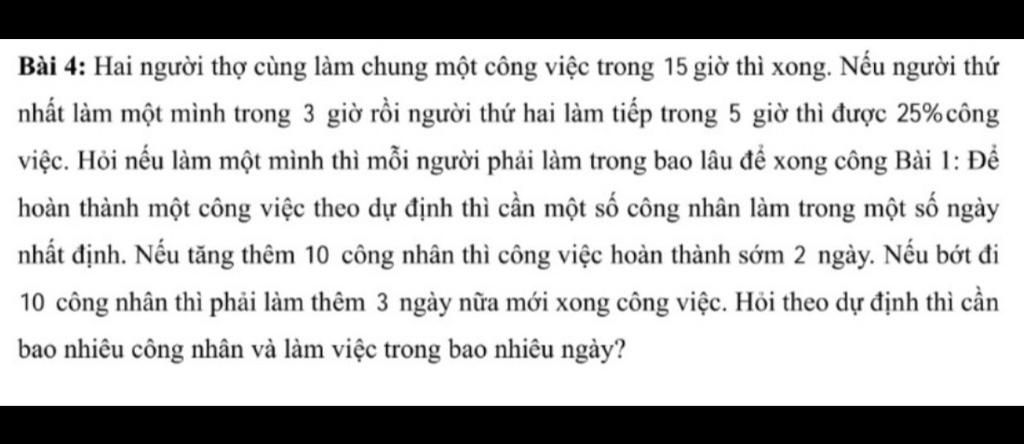Bài 4: Hai người thợ cùng làm chung một công việc trong 15 giờ thì xong. Nếu người thứ