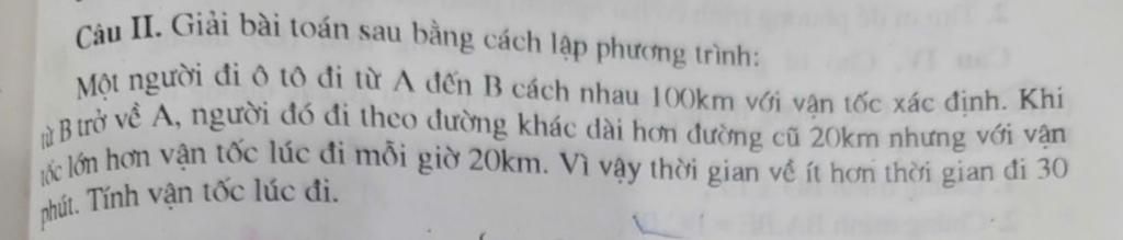 Thời gian về ít hơn thời gian đi là `30` phút nên ta có phương trình: