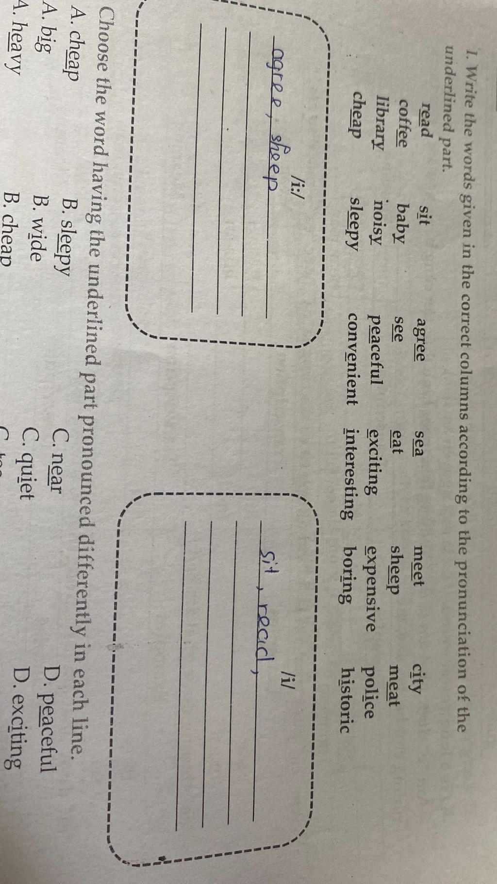 Những từ có âm /i/ là: sit ; meet ; city ; coffee ; baby ; library ; noisy ; excting ; expensive ; interesting ; boring ; historic.